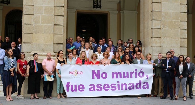 La corporación municipal ha guardado hoy un minuto de silencio a las puertas del Ayuntamiento de Sevilla por la última víctima mortal de violencia machista en Andalucía.
