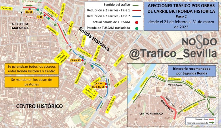 Las obras, que concluirán en junio, afectarán en una primera fase al tramo comprendido entre el Arco de la Macarena y la calle Madre Dolores Márquez, cuya calzada se reducirá a dos carriles durante la obra (los autobuses tendrán un apartado en las paradas para no ocupar el carril y facilitar el tráfico) y quedará en dos carriles más carril bus una vez finalizada la intervención. Este tramo de la Ronda Histórica cuenta actualmente con un carril bus, tres carriles destinados a vehículos particulares (cuatro en algunos tramos) y un carril bus en el sentido contrario. La vía ciclista propuesta discurrirá por el carril más próximo al distrito Casco Antiguo, en muchos tramos delimitado como carril bus. Se prevé que la incidencia en este tramo termine a finales de marzo.