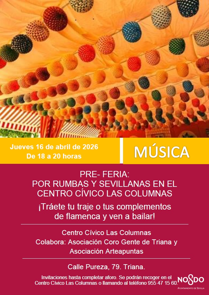 PRE-FERIA: "POR RUMBAS Y SEVILLANAS" https://www.femas.es/centros-civicos/casa-de-las-columnas/eventos/pre-feria-por-rumbas-y-sevillanas PRE-FERIA: "POR RUMBAS Y SEVILLANAS" 2026-04-16T18:00:00+02:00 2026-04-16T20:00:00+02:00 Ver todo CC Casa de Las Columnas Detalles del evento Qué Centro Cívico Casa de las Columnas Cuándo 16/04/2026 de 18:00 a 20:00 Dónde CC Casa de Las Columnas Agregar evento al calendario iCal Acciones de documento Imprimir Enviar Compartir Compartir en facebook Compartir en twitter Compartir en linkedin Compartir en whatsapp