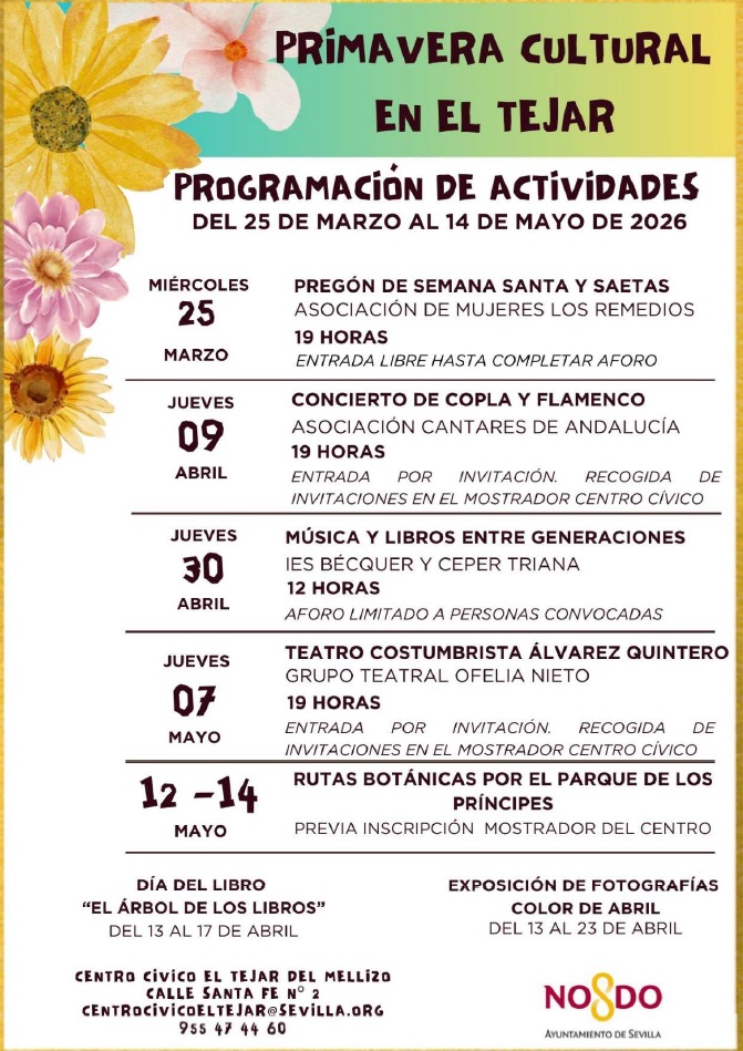 PRIMAVERA CULTURAL EN EL TEJAR https://www.femas.es/centros-civicos/el-tejar-del-mellizo/eventos/primavera-cultural PRIMAVERA CULTURAL EN EL TEJAR 2026-03-25T00:00:00+01:00 2026-05-14T23:59:59+02:00 Programación de actividades Programación de actividades Ver todo Centro Cívico Tejar del Mellizo Detalles del evento Qué Centro Cívico El Tejar del Mellizo Cuándo 25/03/2026 a 14/05/2026 Dónde Centro Cívico Tejar del Mellizo Agregar evento al calendario iCal Acciones de documento Imprimir Enviar Compartir Compartir en facebook Compartir en twitter Compartir en linkedin Compartir en whatsapp