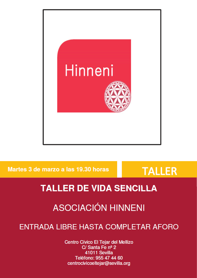 TALLER DE VIDA SENCILLA https://www.femas.es/centros-civicos/el-tejar-del-mellizo/eventos/taller-vida-sencilla-3-3 TALLER DE VIDA SENCILLA 2026-03-03T19:30:00+01:00 2026-03-03T23:59:59+01:00 Ver todo Centro Cívico Tejar del Mellizo Detalles del evento Qué Centro Cívico El Tejar del Mellizo Cuándo 03/03/2026 a partir de 19:30 Dónde Centro Cívico Tejar del Mellizo Agregar evento al calendario iCal Acciones de documento Imprimir Enviar Compartir Compartir en facebook Compartir en twitter Compartir en linkedin Compartir en whatsapp