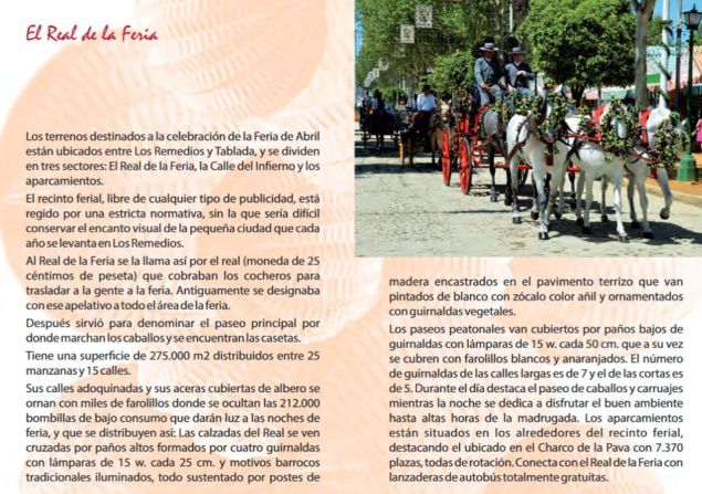 El Real de la Feria Los terrenos destinados a la celebración de la Feria de Abril están ubicados entre Los Remedios y Tablada, y se dividen en tres sectores: El Real de la Feria, la Calle del Infierno y los aparcamientos. Acciones de documento Imprimir Enviar Compartir Compartir en facebook Compartir en twitter Compartir en linkedin Compartir en whatsapp
